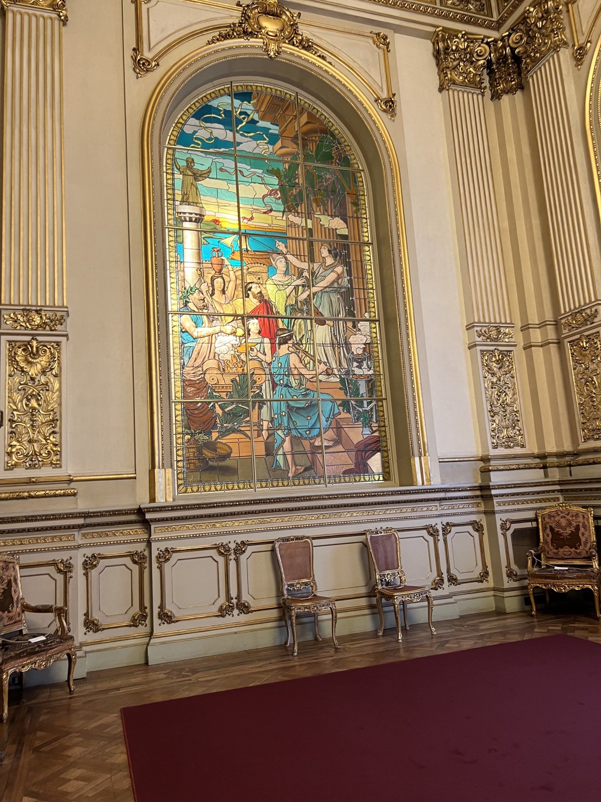 Con una capienza di 2487 spettatori a sedere (che arriva a 4000 calcolando i posti in piedi), suddivisi in sette livelli, la sala all'italiana ha 32 metri di diametro, 75 di profondità e 28 di altezza in un ambiente eclettico, che combina lo stile italiano e il Barocco francese.